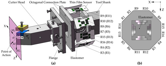 As the development of the micromachine field increases rapidly, the requirements for machining accuracy in machine manufacturing are also increasing. The cutting force is an extremely important physical parameter in the metal cutting process. The state of the machining workpiece, such as the quality of the workpiece and the power consumption of the machine tool, can be directly judged by the cutting force. By studying the cutting force, the machining conditions can be improved and optimized to improve the accuracy of the workpiece. Therefore, the accurate measurement of cutting force is particularly important. In recent years, many researchers have devoted themselves to the miniaturization of dynamometers. They have combined sensing elements, tool holders, and turning tools to measure cutting forces [1,2,3,4]. Zhao, et al. proposed a sensor model for measuring triaxial cutting forces [5,6]. They used two mutually perpendicular octagonal ring structures as elastic elements. Their experiments showed that the cutting force sensor combined with the structure had good accuracy with an error from 0.38% to 0.83%, and they found through modal analysis that the cutting force sensor also had a superior natural frequency. Richárd Horváth and Tibor Pálinkás designed a dynamometer for measuring cutting forces in fine cutting [7]. They installed a piezoelectric cell under the cutting insert which had a new tool holder structure. The cutting force was measured by the electrical charge generated by the mechanical deformation of the piezoelectric crystal. Their experiments showed that the measuring accuracy of the dynamometer was 0.1 N. However, these researchers did not reveal the measurement mechanism of the dynamometer, and they did not consider the influence of the structural parameters of the dynamometer on its own strength, stiffness, and sensitivity. Moreover, due to the limitation of the pasting process, the resistance strain gauge had a large measurement bias signal. The piezoelectric crystal [8,9,10,11] had a poor unidirectionality of the charge, so there was a serious interference phenomenon when the force was measured in three directions. In recent years, with the development of MEMS technology [12,13,14,15], various thin-film sensors have been widely used [16,17,18]. Tao, et al. embedded a thermocouple film into the cutting insert to measure the cutting heat [19]. Welf-Guntram Drossel, et al. prepared a piezoelectric film sensor by chemical vapor deposition in order to measure the cutting force during milling [20].
