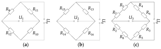 As shown in Figure 1, the eight sensor units are mounted around the elastomer. The 16 thin-film resistor grids are connected into three Wheatstone bridge circuits, as shown in Figure 2. The bridge circuits 1–3 measure the main cutting force Fz, the feeding force Fx, and the thrust force Fy, respectively, and their output voltages are:
