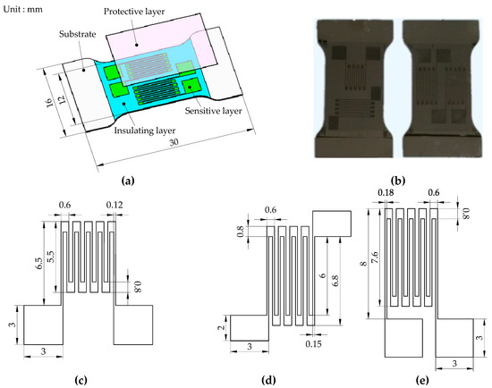 Alloy film sensor: (a) Sensor structure, (b) fabricated sensor, (c) sizes of the resistance grids R1, R3, R5, and R7, (d) sizes of the resistance grids R2, R4, R6, and R8, (e) sizes of the resistance grids from R9 to R16.