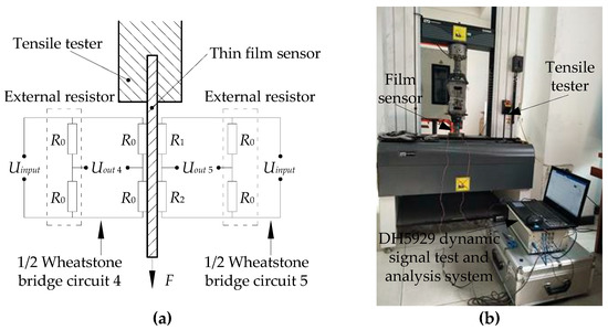 Film sensor uniaxial tensile test: (a) Bridge circuit diagram, (b) experimental device.