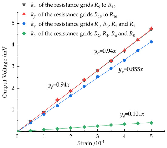 The strain sensitivity coefficient of each film sensor is calibrated using the uniaxial tensile test. The test device mainly includes a DH5929 dynamic signal test (Instron, Shanghai, China) and an analysis system, a film sensor and a tensile tester, as shown in Figure 5. Two resistance strain gauges are attached to the back surface of the substrate at the same position as the sensor resistance grids. The two strain gauges are connected to the external resistors as the one-half bridge circuit 4. R1 and R2 are thin-film resistance grids in the sensor. R1 and R2 are connected to two external resistors as the one-half bridge circuit 5. There is an input voltage of 10 V in circuit 4 and circuit 5, respectively. The unidirectional tensile force is applied to the film sensor by the tensile tester in the elastic strain range. The strain of the elastic substrate is measured using circuit 4. Then, the relationship curves in Figure 6 are obtained by measuring the output voltage of circuit 5. Among them, the fitting function of these curves is: