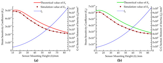 Relationship between sensor mounting height and dynamometer strain sensitivity coefficient: (a) K1 and h relationship curve, (b) K2 and h relationship curve.