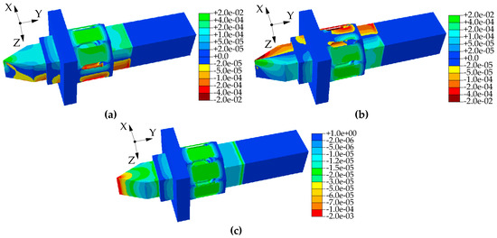 Dynamometer strain cloud: (a) Strain cloud with one-way force Fz of 1000 N, (b) strain cloud with one-way force Fx of 1000 N, (c) strain cloud with one-way force Fy of 1000 N.