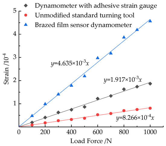 Figure 10 shows the relationship between the strain of the elastic substrate and the applied load when a one-way force Fz from 0 to 1000 N is applied to the tool nose. The relationship between the two has a good linearity, and the slope of the fitted curve is K1. The K1 value of the brazed film sensor dynamometer is 4.635 × 10−7, which is a 8.6% difference from the theoretical value. The K1 value of the dynamometer with adhesive strain gauge is 1.917 × 10−7, which is a 62.2% difference from the theoretical value. Obviously, this is the result of the pasting process reducing the strain transmission efficiency. However, the K1 value of the dynamometer with adhesive strain gauge is about 2.32 times that of the standard turning tool, which is a 5.8% difference from the theoretical calculation result. Experiments show that the dynamometer can improve the strain sensitivity of the measurement system, which helps the measurement signal acquisition.