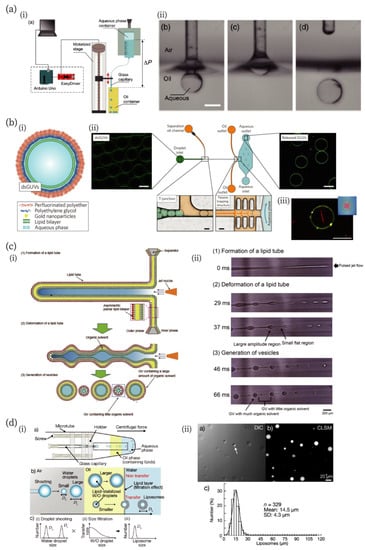 Droplet microfluidics technology can be used to fabricate not only W/O emulsions, but also other compartments for artificial cells, including multi-component double emulsions [38,39,40], droplet interface bilayers (DIBs) [41,42,43,44,45,46], polymersomes [26,47], and GUVs [48,49,50,51,52,53,54,55,56,57,58]. In the case of multi-compartment double emulsions, smaller emulsions are further encapsulated into larger emulsions. The methods reported by Adams et al., Che et al., and Chu et al. allow the encapsulation of a large number of smaller, inner emulsions into the outer emulsion [38,39,40]. Regarding DIBs, Elani et al. and Walsh et al. have reported DIBs in a W/O emulsion containing multiple droplets [41,42]. In addition, Baxani et al. have developed a robust platform for creating artificial cells with a DIB [43], combining the T-junction and co-flowing methods (Figure 1b). The chassis is covered with an alginate gel compartment containing droplets that formed the DIB. The chassis was found to be stable in an aqueous, an oil, and even in an air phase, and was also mechanically stable (Figure 1b (ii) and (iii)).