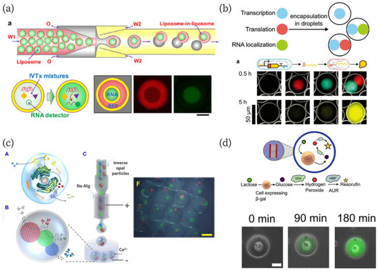(a) Schematics of the fabrication method for “liposome-in-liposome”, and in vitro transcription and transcription/translation in “artificial nuclei” and “cytoplasm” [96]. Scale bar: 50 µm. Reproduced with permission from [96]. (b) Artificial gel-based organelles in W/O emulsion that exhibit transcription and translation in each artificial organelle [98]. Reproduced with permission from [98]. (c) Schematics of a biomimetic enzyme cascade reaction in the microcapsule and a microscopic image of the microcapsule with three-cores [99]. Scale bar: 400 µm. Reproduced with permission from [99]. (d) A schematic of the enzymatic pathway containing a living cell as an organelle-like bioreactor and sequential microscopic images representing a successful reaction with the aid of the cell [100]. Reproduced with permission from [100].