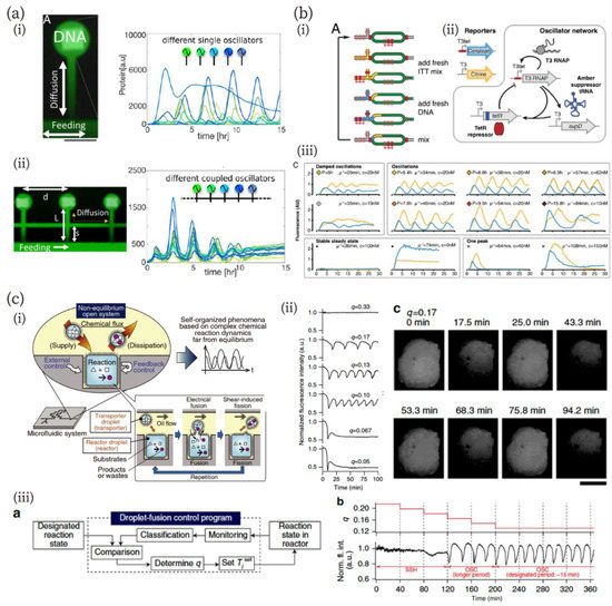 (a) On-chip DNA compartments as artificial cells [106]. (i) An image of expressed green fluorescence protein (GFP) (green) and DNA patterns (white), and a graph of oscillation dynamics in 15 different compartments. Scale bar: 100 µm. (ii) An image of three coupled compartments and a graph of the synchronized oscillations in the coupled compartments. Reproduced with permission from [106]. (b) In vitro transcription/translation system in a microfluidic nanoreactor [113]. (i) and (ii) Schematics of the nanoreactor (i) and an oscillator network (ii). (iii) Oscillation behavior of the network in the nanoreactor controlled by microfluidic parameters. Reproduced with permission from [113]. (c) Chemical reactions far from equilibrium in a droplet open-reactor system [114]. (i) Schematic diagrams of the experimental system in which fusion/fission of droplets were electrically controlled. (ii) pH Oscillation reaction depending on the ratio of fusion states in the fusion–fission process (shown as q in the figure). Scale bar: 500 µm. (iii) Feedback control of pH oscillation using the droplet open reactor system: scheme of feedback control (left) and time course of q and oscillation behavior during the feedback control. Reproduced with permission from [114].