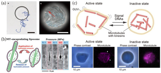 (a) Autonomous motility of the W/O droplet containing microtubule-kinesin bundles [120]. A bright-field image of the droplet (left) and a fluorescence image of microtubules (right). Scale bars: 80 µm (left) and 100 µm (right). Reproduced with permission from [120]. (b) Morphological changes of GUVs encapsulating tubulins that are polymerized to microtubules in response to hydrostatic pressures [14]. Reproduced with permission from [14]. (c) An amoeba-type molecular robot capable of changing its shape in response to signal DNA molecules [127]. Reproduced with permission from [127].