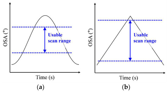 Definition of usable scan ranges (USRs) of the optical scan angle (OSA) for different waveforms: (a) sinusoidal and (b) triangular.