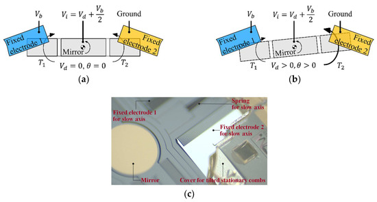 For the V-linearization of the microscanner, the DC bias voltage (Vb), the ground, and the input voltage (Vi) are applied to fixed electrode 1, fixed electrode 2, and the mirror, respectively, as shown in Figure 2a, where Vi is the sum of the driving voltage (Vd) and Vb/2. The electrostatic torques (T1, T2) generated on movable electrodes 1 and 2 can be calculated using Equations (1) and (2), respectively. When Vd is zero, the magnitudes of T1 and T2 are equal to each other, staying at the initial position. Figure 2b shows that the value of Vd is greater than 0, resulting in the rotation of the mirror in the counterclockwise (positive sign) direction. Note that the total torque (T1 + T2) is linearly proportional to Vd, as expressed in Equation (3). Likewise, the linearization procedure can be extended to the case where the scanner is driven by alternating current (AC) driving voltage. Figure 2c shows a photograph of the microscanner with the tilted stationary combs used in this study.