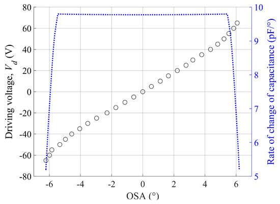 The experimental OSA under the V-linearization condition is shown with respect to the direct current (DC) voltage in Figure 3, where the bias voltage, Vb, is 130 V, and the driving voltage, Vd, is in the range from −65 V to 65 V. Despite the V-linearization process, nonlinearity is still witnessed when the mirror is rotated beyond a certain critical angle. This result is believed to be mainly determined by the change rate of the overlapped area between the pair of comb electrodes.
