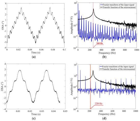 When a triangular input voltage is provided, undesired residual oscillations can occur in the scan output. Figure 4a shows the experimental scan output with severe residual oscillations in a steady-state response when a triangular input waveform is applied at a driving frequency of 20 Hz to the microscanner. The driving frequency of 20 Hz was selected as an example, showing that this residual oscillation occurs when one of the harmonics of the input frequency might be near to the frequency of the fundamental mode in the scanner.