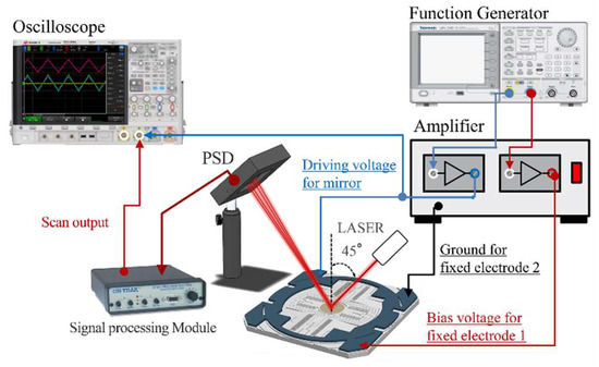 The experimental setup to obtain the transfer function is shown in Figure 5, where the laser diode emits a laser beam (wavelength = 633 nm) through the collimator (Pigtailed collimator, OZ Optics, Ottawa, ON, Canada) to the mirror with an incident angle of 45°. As the first step of the experiment, the input pulse is applied to the scanner through a two-channel function generator (AFG3102, Tektronix, Beaverton, OR, USA) with a bandwidth of 240 MHz and a power amplifier (A400D, FLC electronics, Partille, Sweden) with a bandwidth of 500 kHz, consecutively. Next, a position-sensitive detector (PSD) (PSM2-45, Ontrak Photonics, Irvine, CA, USA) measures the position of the laser/beam reflected from the oscillating micromirror. Finally, the PSD signal is digitized at 50 kHz using an oscilloscope (DSO-X-4024A, Keysight, Santa Rosa, CA, USA) over a period of one second to extract 50,000 data points in total.