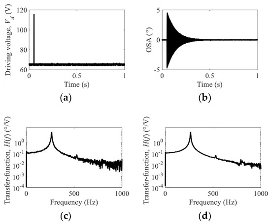 In the case of closed-loop control, the angular position of the mirror can be accurately adjusted by feeding back the positioning error to the controller. The angular position of the mirror can be further corrected by the additional use of the second-order transfer function which was already extracted from the open-loop control [3,9]. Consequently, closed-loop control shows good performance with high robustness regardless of the residual oscillations or external disturbance. Moreover, closed-loop control can maintain good performance despite the presence of a fatal error in the second-order dynamic modeling. However, this closed-loop control approach requires position detection devices, such as capacitive [13,14] and piezoresistive [15] sensors, making the fabrication process more complicated.