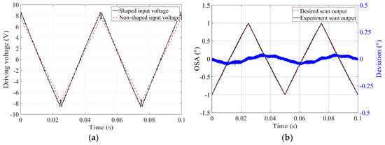 Performance of the input shaping method based on an experimental transfer function (ISETF): (a) the shaped input and non-shaped input for the optical scan range from −1° to 1° and (b) comparison between the ideal triangular output and the experimental scan output obtained using the shaped input based on an experimental transfer function (ETF).
