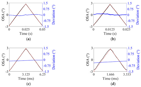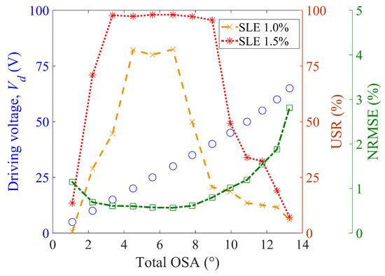 As a strict performance index, the USR was also estimated under a given criterion defined by the scan line error (SLE) as a percentile. For example, an SLE of 1% indicates that a certain scan line deviates from the intended trajectory by 1% of the total OSA. In other words, the USR is the longest scan range where the difference between the desired output and the scan output is less than 1% SLE. The estimated USR is shown in Figure 9 with respect to the total OSA at for SLEs of 1.0% and 1.5%.