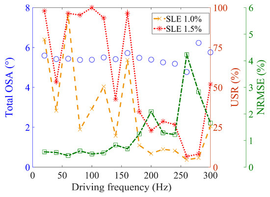 For a driving frequency of 180 Hz or higher, the USRs fall off below 52% because the higher driving frequencies include a smaller number of harmonics in the input shaping calculation. The reduction in harmonics is attributed to the limitation from the Nyquist criterion, which results in the degradation of the triangular shape of the output. Note that the NRMSE value decreases with the USR, implying that the validity of the USR in the range of driving frequency is similar to that in the range of the OSA.
