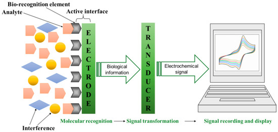 The bio-recognition element is the core component of the electrochemical biosensor which was fixed on the surface of the electrode by physical or chemical method. The biosensor can selectively identify the target molecule and capture it onto the electrode surface, owing to the specific recognition function of bio-recognition element with the substance to be tested. As the main body of the signal converter, the electrode can derive the identification signal generated on the surface of the electrode and convert it into an electrical signal, including current, voltage, and resistance, which can be measured and analyzed in order to achieve qualitative or quantitative analysis of the analysis target. The operating principle of electrochemical biosensor is shown in Figure 1.