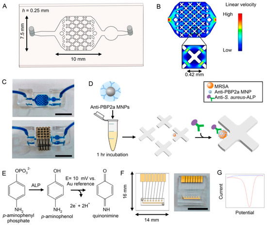 Bacterial capture and electrochemical detection. (A) Schematic of bacterial capture device fabricated in PDMS. (B) Flow profile of capture device simulated on COMSOL Multiphysics. X-shaped features create areas of reduced flow velocity. (C) Photograph of bacterial capture device filled with dye in the absence, and presence of, an array of external magnets (above and below images, respectively). Scale is 10 mm. (D) Filtered nasal swab specimen is incubated with anti-PBP2a MNPs for 1 h. The solution is then processed with the device, where magnetically-labeled bacteria are captured in areas of low flow velocity. After wash steps, anti-S. aureus antibodies functionalized with ALP are introduced into the device and washed. (E) The substrate p-APP is introduced to the device, where it is converted to electrochemically active p-AP by ALP. p-AP is oxidized to quinonimine at a potential of 10 mV against a gold reference electrode. (F) Schematic (left) and photograph (right) of electrochemical detector chip. A PDMS channel allows simple transfer of electrochemical readout solution from the capture device. Detection utilizes on-chip working and reference gold electrodes and an external Pt counter electrode. Scale is 10 mm. (G) Differential pulse voltammogram displaying signal from p-APP (blue) and p-AP (red). The measured current correlates to number of captured bacteria. Reprinted with permission from [83]. Copyright (2019) American Chemical Society.