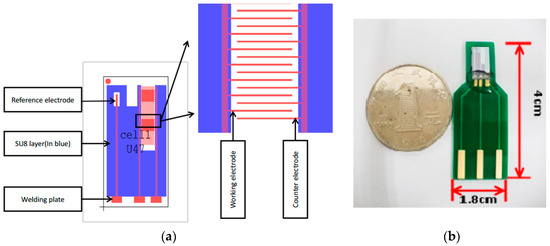 (a) The structure diagram and (b) the picture of the ultramicro interdigital electrode array chip.
