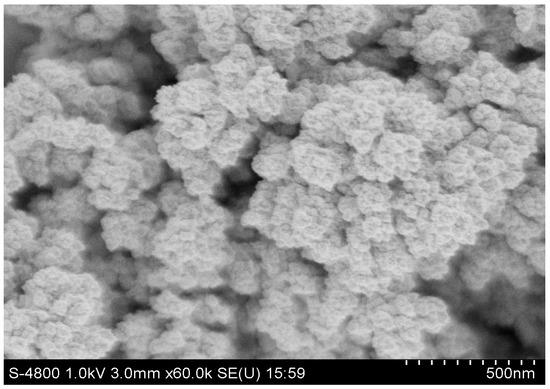 The obtained ultramicro interdigital electrode chip was cleaned by cyclic voltammetry (CV) method scanning in 0.05 M dilute sulfuric acid. The scanning voltage range was from −0.2 V to 1.5 V and the scan rate was 50 mV/s. Metal palladium was electrodeposited on the platinum-based ultramicro interdigital electrode array by using the potentiostatic method. Firstly, palladium was electrodeposited on the working electrode at a fixed potential of −0.4 V for 100 s. The concentration of the electrolyte for palladium is 20 mmol/L, which is obtained by dissolving PdCl2 in NaCl of 1 mol/L. The SEM image (× 60K) of the metal palladium is shown in Figure 2, in which the spherical metal palladium can be seen clearly.