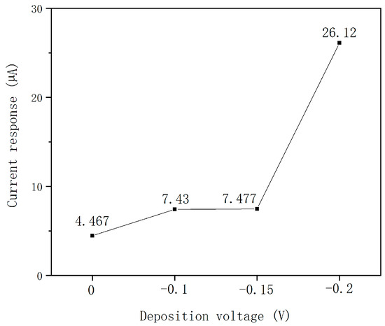 After the palladium was modified on the electrode, the AuNPs was electrodeposited on the palladium layer with a fixed potential of −0.2 V for 300 s. The electrolyte for AuNPs is 10 mmol/L of HAuCl4. The deposition voltage was optimized by electrochemical linear sweep voltammetry (LSV). Firstly, five kinds of deposition voltage were chosen according to the electrochemical property of Au in 10 mmol/L of HAuCl4. The voltages were 0 V, −0.1 V, −0.15 V, −0.2 V, and −0.3 V. Then, the five chips modified with Pd-AuNPs under different deposition voltages were used to detect the neutral potassium nitrate solution with a concentration of 1 mg/L. Finally, the current responses obtained above were compared together (as seen in Figure 3). The results showed that the current response is highest when the deposition was −0.2 V. The AuNPs aggregated when the deposition was −0.3 V and the WE and CE were connected together, under which condition detection cannot go on. Therefore, −0.2 V was chosen to be the deposition voltage of AuNPs.