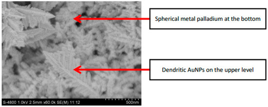 The SEM image (× 60K) of the Pd-AuNPs composite sensitive film is shown in Figure 4, in which the spherical metal palladium at the bottom and the dendritic AuNPs on the upper level can be seen. The average diameter of metal Pd is about 1.4 μm and the average branch width of metal AuNPs is about 90 nm.