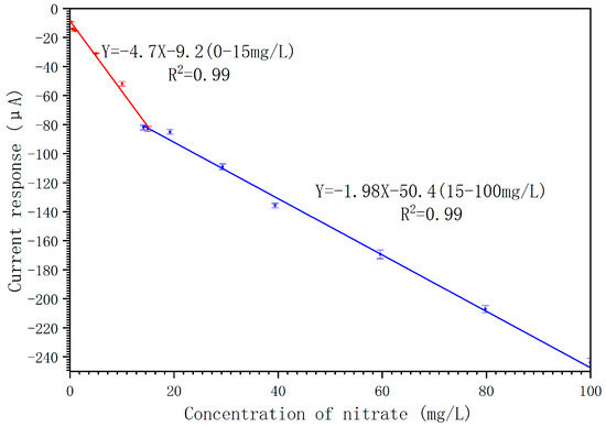 The response curve is shown in Figure 7. The results indicate that the ultramicro interdigital electrode chip modified by Pd-AuNPs composite sensing film can be used for the detection of nitrate ion concentration in neutral water with a pH of 7.2 and the linearity is good, at 0.99. The sensitivity is 4.7 μA·mg−1·L when the concentration of the nitrate is lower than 15 mg·L−1, and the detection limit is 0.074 mg·L−1 (3δ, δ is the ratio of signal-to-noise). The sensitivity is 1.98 μA·mg−1·L in the range of 15–100 mg·L−1. The results showed that the chips modified by Pd-AuNPs composite sensing film can also be used for the determination of nitrate with high concentration, though the sensitivity is relatively low.