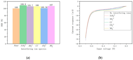Firstly, 10 mg·L−1 potassium nitrate solution (with PB as buffer) and 100 mg·L−1 interference solution (with water as buffer) were prepared. The interference ions are silicate-containing ion SiO32−, sulfate ion SO42−, chloride ion Cl−, carbonate ion CO32−, and nitrite ion NO2−. Then, we mixed the potassium nitrate solution, interference solution, and deionized water to obtain the potassium nitrate solutions containing various interfering ions. Chips modified by Pd-AuNPs composite sensing film were used to detect the potassium nitrate solution with a non-interfering ion and five kinds of interference ions, respectively. The influence of each interference ion on the current response of nitrate ions was detected. The relative standard deviations caused by the presence of interfering ions and the response curves for nitrate detection with different interfering ions are shown in Figure 8a,b. The results indicate that ultramicro electrode chips modified by the composite sensing film in this paper have certain anti-interference ability, which can ensure that the deviations caused by common interference ions were all less than 10%.
