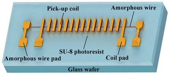 In order to obtain an amorphous GMI magnetic sensor with small size and high device uniformity, a square pick-up coil was designed and integrated with the amorphous wires using the MEMS processes [15]. The new structure makes it easier and more flexible to change the geometry of the pick-up coil, thus allowing more precise control and change of the output voltage of the amorphous GMI magnetic sensor. The device structure is shown in Figure 1.