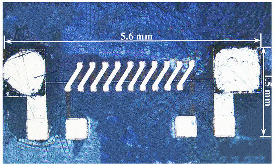 The amorphous wire is fixed by copper electroplated at both ends thereof and attached to the Cr/Cu seed layer. Except for the amorphous wire and the pick-up coil pad, the entire device is wrapped with a SU-8 photoresist to avoid deformation and fracture of the amorphous wire and the micro-coil. The resulting amorphous GMI magnetic sensor device has a size of 5.6 mm × 1.5 mm × 1.1 mm, which reduces the sensor volume compared to the method of soldering and manual winding and improves the device uniformity of the sensor. The electron micrograph of the amorphous GMI magnetic sensor device is shown in Figure 3.
