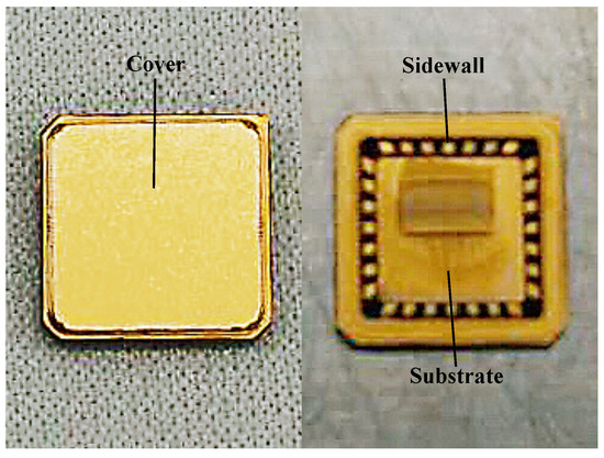 To further protect the microstructure of the amorphous GMI magnetic sensor device and facilitate the integration of sensor circuits, a silicon nitride ceramic tube was used as a package for the device, as shown in Figure 4. The ceramic package can form a hollow, airtight structure with excellent mechanical rigidity, and the thermal expansion coefficient is close to that of silicon, thus the stress with the silicon substrate is small. The silicon nitride ceramic package includes a substrate, a sidewall, and a cover. The substrate is fixed to the amorphous GMI magnetic sensor device by welding. The inner and outer sides of the sidewall are provided with pads and electrically connected, and the amorphous wires and the coil pads are respectively connected to the ceramic package pads by wire bonding techniques. The cover plate is fixed on the upper surface of the sidewall of the ceramic tube by adhesive to form a sealing structure, and the inside of the tube is filled with nitrogen to form an airtight environment.