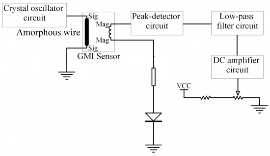 In order to preprocess the output voltage of the amorphous wire GMI magnetic sensor device, a signal conditioning circuit was designed. Most current GMI magnetic sensors use a CMOS multi-vibrator to generate the excitation current and an analog switch as the peak sample-and-hold circuit, as proposed by Professor Mohri [14]. These circuits are complex in structure and poor in flexibility. We only used the crystal oscillator circuit and an improved diode detector circuit to ensure the high performance of the sensor without the feedback circuit, which helped to ensure the consistency of the amorphous GMI magnetic sensor in the productization. The sensor system was composed of the amorphous wire device, a crystal oscillator circuit, a peak-detector circuit, a low-pass filter circuit, and a DC amplifier circuit, as shown in Figure 5.