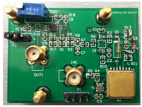 where Ad is the open-loop gain of the operational amplifier, generally above 80 dB; UD is the diode deadband voltage. For Schottky diodes, UD ≈ 0.2 V. Ui is very small, approximately zero, which eliminates the dead zone of the diode. At the same time, the operational amplifier operates in the voltage follow state when the diode is turned on, thereby eliminating the nonlinear effects of the diode. Some high-frequency components in the detection signal cannot be completely attenuated due to the limitation of the detection circuit time constant, and the interference of the external magnetic field cannot completely eliminate the ringing phenomenon, thus the detection signal needs to be smoothed before the amplification circuit. Compared to other low-pass active filters, the Butterworth filter has the most stable amplitude characteristics in the passband and good linear phase characteristics. The amorphous magnetic sensors mainly focus on the amplitude-frequency characteristics of the filter circuit; thus, a second-order Butterworth low-pass filter is used to achieve signal filtering. According to the magnetic field frequency characteristics of the target to be detected and the requirements of filtering the carrier wave and the high frequency interference signal, the cutoff frequency of the low pass filter is determined to be 1 kHz, and the resistance value and the capacitance value in the filter circuit can be determined by the transfer function. In order to minimize the sensor size, we use the same OP2177 chip to realize the DC amplifier circuit and the low-pass filter circuit. The OP2177 is a dual low-noise operational amplifier with extremely low offset voltage characteristics and input bias current characteristics, thus ensuring low noise introduced. Since the giant magneto-impedance effect of the sensor is very obvious, the voltage output value changes greatly within the selected range, thus the magnification is selected as 20. In addition, a sliding rheostat is connected to the forward input of the op amp to ensure that the magnetic sensor outputs at a zero value at zero magnetic field. The sensor system is powered by a ±5 V dual supply, and the entire amorphous wire GMI magnetic sensor PCB board is shown in Figure 6.
