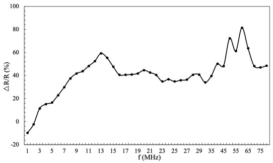 The frequency of the excitation current strongly influences the GMI effect, and the amorphous wire will exhibit distinct characteristics in different frequency ranges. The current frequency of research on GMI materials has reached several GHz [18,19,20,21]. In order to explore the optimum operating frequency of the amorphous wire material we used, the detection circuit was designed, which included a digital signal generator, the amorphous wire, and a standard resistor. The digital signal generator supplied the amorphous wire with current excitation of different frequencies. The current signal waveform is a sine wave with an amplitude of 5 Vpp and an offset of 2.5 V. The amorphous wire was connected in series with the standard resistor to obtain the current. The entire circuit was placed in an FE-1MF Helmholtz coil that provided an applied magnetic field, and an oscilloscope was used to measure the peak value of the output voltage across the standard resistor. It is worth noting that in order to avoid the influence of the earth’s magnetic field, the applied magnetic field Hex is always perpendicular to the direction of the earth’s magnetic field during the measurement. Limited by the experimental conditions, we calculated the resistance of the amorphous wire instead of the impedance to characterize the GMI effect of the amorphous wire, resulting in Equation (4).