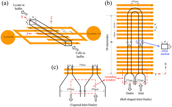 The two-dimensional “walls” of high intensity electric field generated by the edges of planar electrodes were more effective at intercepting translating cells in comparison with the spike-like high intensity field regions (like a “fence” instead of a “wall”) generated by three-dimensional electrodes in the literature, for example, Ref. [16]. There were four such “walls” in each cycle of electrical excitation; thus, a total of 200 “walls” were present in the channel of the device, as shown in Figure 1b.
