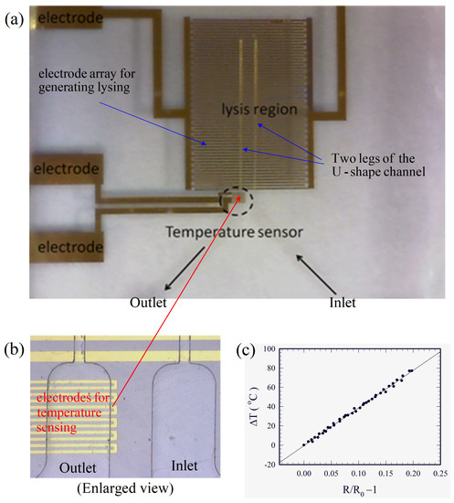 The completed device is shown in Figure 2a. As temperature could crucially affect the present electrical cell lysis due to Joule heating, a temperature sensor was also fabricated on the substrate at the outlet for monitoring the temperature, as shown in Figure 2b, using the same technique as that in fabricating the electrodes for cell lysis. Measurement of the temperature sensor was based on the thermal-resistive effect, and it was calibrated using a commercial infrared-ray temperature sensor. The change of temperature was linearly proportional to the change in electrical resistance , as shown in Figure 2c, where is the resistance at the reference temperature . A correlation according to the data in Figure 2c was obtained as: