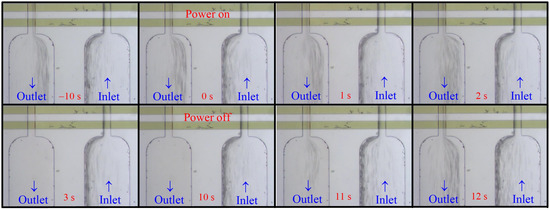 Figure 3 and Figure 4 show snapshots at different times from Video S1 and S2 (Supplementary Materials) for the lysis of human red blood cells of cases B1 and T2, respectively, in Table 1. The dilute blood was pumped through the device for more than 10 s before the electric power of the electrodes was turned on. The clock was set to 0 s when the power was on in Figure 3 and Figure 4. The primary difference between these two cases was that they had different inlets/outlets, as shown in Figure 1b,c, respectively, such that the flowing cells could be observed more clearly in case T2 even though its volume flow rate was twice that of case B1. Consider first case B1 in Figure 3. The flow of cells was quite rapid such that we could see only crowded “streaklines” (the black lines) of cells instead of the individual cells clearly. The streakline pattern at the bell-shape outlet region at 0 s appeared essentially the same as that at −10 s, indicating that the mechanical shear and extensive stresses alone from the flow could not induce cell lysis for the present device. After the electric field was applied for 3 s, the streaklines disappeared at the outlet as shown in the figure at 3 s, showing that the cells were lysed. The time interval between the instant when streaklines (cells) first disappeared at the outlet and the instant when the power was switched on was defined here as the time for complete lysis, tCL, for describing the “efficiency” of cell lysis. A smaller value of tCL represented a better efficiency. Note that tCL is a parameter defined here for convenience, not a parameter precisely defined technically. A transit time, ttr, was required for the fluid and cells to flow through the device. Here we chose ttr as L/uav, with uav the average axial flow speed in the channel, and L the channel length. Such a ttr was just a characteristic value for the transit time representing an average value. The cells seen at the outlet were roughly ttr earlier on average than those in the inlet. tCL = 3 s > ttr = 1.59 s for case B1, because there were certain amounts of cells moving closer to the wall, and they needed longer times to transit the channel. ttr was a parameter averaged over all the cells while tCL was a parameter that took into account all the cells through the channel, and tCL > ttr for all the cases in Table 1. No streaklines (no cells) were observed in the outlet, in comparison with crowded streaklines in the inlet, between 3 s to 10 s when the power of the electrodes was on, showing that cells were lysed continuously as they passed through the device during this time interval. The streaklines (cells) reappeared in the outlet region 1 s (see the figure at 11 s) after the power of electrodes was turned off at 10 s. The streakline pattern at 12 s (2 s after the power was off) recovered and looked similar to that at 0 s.