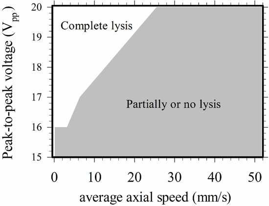 All of the above discussions in this section were for cases with applied voltage equaling 20 Vpp. Experiments at lower applied voltages were also performed, and it was found that the minimum applied peak-to-peak voltage (2V0) for complete lysis was 16 Vpp, and the minimum flow rate was about 1 μL/hr in the present device. The map for complete lysis for 16–20 Vpp and uav = 1.3–51.7 mm/s is shown in Figure 5. Here, the average axial speed was employed, instead of the volume flow rate as a parameter for illustration, to take into account the data from different channel widths. A higher applied voltage was required for a higher flow speed. No cell lysis occurred when the flow speed was zero, as the negative dielectrophoretic force pushed all the cells away from the electrode edges where the local field strength was high; the cells settled on the central part of the electrodes without lysis.