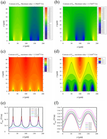 (a) Contours of the x-component electric field phasor, Epx. (b) Contours of the z-component electric field phasor, Epz. (c) Contours of the root mean square of the electric field, Erms (full range). (d) Contours of Erms (partial range) for a clear picture of values around 1.2 × 105 V/m, the irreversible threshold value for electroporation, Eth2. The black curves starting from above in (d) are the major contours of values 1.2 × 105 (the black M-shape curve), 2.4 × 105, and 3.6 × 105 V/m (four half ellipses enclosing the electrode edges), respectively. There are five minor contours between any two major contours, with a 2 × 104 V/m difference in value between any two minor contours, for example, the values of the minor contours above the M-shape curve are 1.0 × 105, 0.8 × 105, 0.6 × 105, 0.4 × 105 and 0.2 × 105, respectively, starting from below (from yellow to red colors). (e) and (f) Variations of Erms with x at different heights (z). The applied voltage is 20 Vpp.