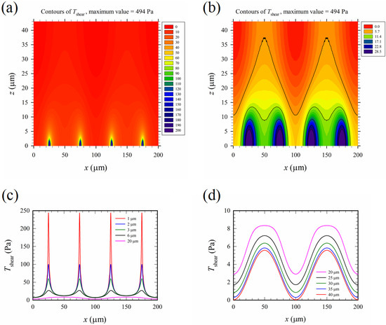 (a) Contours of the maximum Maxwell shear stress, Tshear (full range). (b) Contours of Tshear (partial range) for a clear picture of values around 5.7 Pa, which corresponds to Erms = Eth2 = 1.2 × 105 in Figure 6d. The black curves starting from above in (b) are the major contours of values 5.7, 11.4, 17.1, 22.8, and 28.5 Pa, respectively (similar convention as that in Figure 6). There are five minor contours between any two major contours, with a 0.95 Pa difference in values between any two minor contours. (c) and (d) Variations of Tshear with x at different heights (z). The applied voltage is 20 Vpp.
