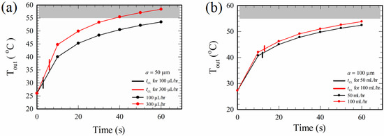 Variations of outlet temperatures, Tout, with time for different flow rates and channel widths: (a) a = 50 μm, and (b) a = 100 μm. The vertical short line intersecting each curve marks the time for complete cell lysis of the corresponding case. The grey region for temperature greater than 55 °C is the region for thermal lysis of red blood cells.
