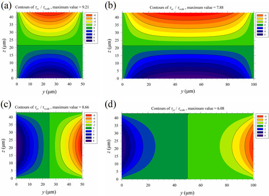 The distributions of the normalized mechanical shear stresses of the Posieuille flow. (a) τzx /τscale, a = 50 μm. (b) τzx /τscale, a = 100 μm. (c) τyx /τscale, a = 50 μm. (d) τyx /τscale, a = 100 μm. The black curves show the major contours (starting from the region near the walls), with values the same as those in the color bars. There is one minor contour between any two major contours. Here τscale = μuav/b, with values for different cases shown in Table 1.