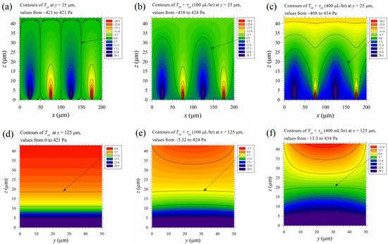 The relative importance between the time-mean Maxwell shear stress component Tzx and the mechanical shear stress component, τzx. (a–c) are results on the vertical mid plane at y = 25 μm, and (d–f) are results on the vertical cross sectional plane at x = 125 μm. (a) and (d) are the pure Maxwell stresses; (b) and (e) are the total stresses with volume flow rates of 100 μL/hr, while (c) and (f) are those at 400 μL/hr. The applied voltage is 20 Vpp. The sign conventions of the contours are similar to those in Figure 7b.