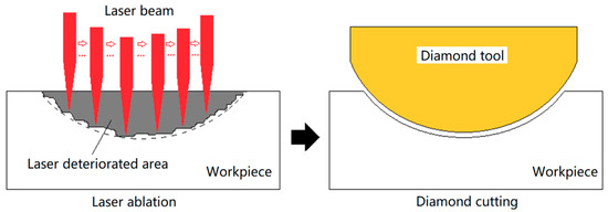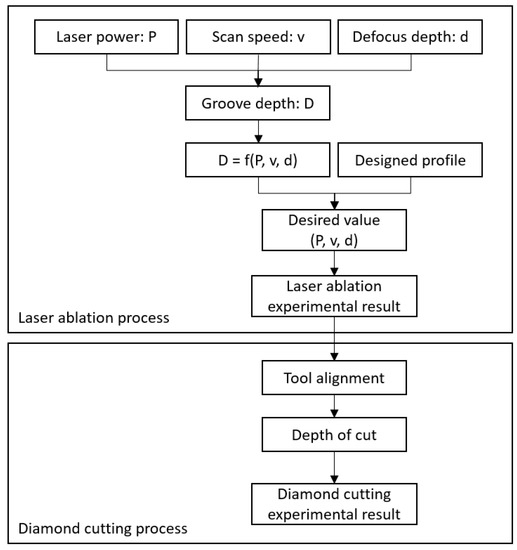 The flow chart of the hybrid machining process is shown in Figure 2. First, the influence of the laser ablation parameters, such as scan speed, laser power and defocus depth on ablation depth was investigated. Second, grooves with pre-designed shapes were generated by the laser ablation method with the optimized laser ablation parameters. Third, tool workpiece re-alignment and diamond cutting experiments were performed.