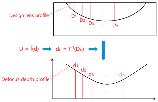 Figure 5 shows the procedure for determining the defocus depth profile. First, the actual depth of the designed lenticular lens at different positions, Dn, was calculated. Then according to the relationship between the laser ablation depth and defocus depth obtained from the experimental result, the defocus depth, dn, was calculated. The interval between two laser scanning paths was set to be 5 µm.