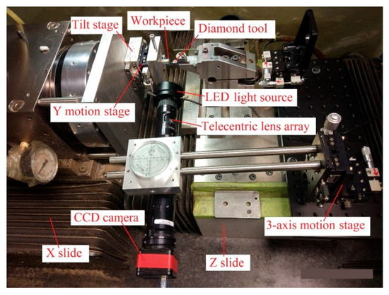 The diamond cutting experiment was performed on a Nanoform 200 ultra-precision lathe. Figure 6 shows the setup of the diamond cutting experiment. A charge-coupled device (CCD) camera was mounted on the lathe to assist with the alignment work. The tilt stage was used to tilt the workpiece surface to make sure the cutting process could be performed under a constant depth of cut. The Y motion stage was used to adjust the position of the workpiece along the vertical direction.