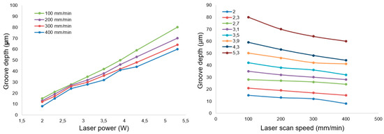 It can be seen from this image that the depths of these laser-generated grooves were almost the same, which means the repeatability of the laser ablation process was reliable, and thus acceptable for our purpose. Laser ablation experiments with changing laser power and scan speed were conducted. Figure 8 shows the experimental results that indicated the influence of laser power and scan speed on laser ablation depth. A linear relationship between laser ablation depth and laser power can be seen. A linear relationship can similarly be seen between the laser ablation depth and scan speed.