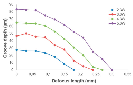 Figure 9 shows the experimental results of the influence of defocus depth on the laser ablation depth. The laser scan speed was fixed to 400 mm/min for all experiments. Unlike the relationship between laser ablation depth and laser power, which could be depicted with a linear function, the influence of defocus depth on laser ablation depth was a non-linear effect.