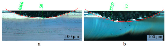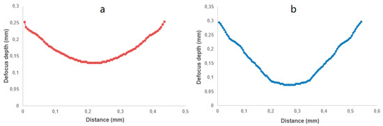 The cross-sectional profile of the lenticular lens groove was an arc. In this experiment, two grooves with different depths were generated in the laser ablation process. The design arc radius of the grooves was 0.5 mm, and the depths of the grooves were 50 µm and 80 µm. The width of the grooves were calculated to be 0.436 mm and 0.543 mm, respectively. The width of a single laser ablated groove was around 5 µm, which could be estimated from Figure 7. Thus, to generate one lenticular lens groove, tens or even more than one hundred repetitions of laser scanning passes were required. For the lenticular lens groove, the depths were different at different positions of the arc. In the experimental process, this was realized by changing the defocus depth. The procedure to determine the defocus depth profiles was shown in Figure 5. The defocus depth profiles for the designed lenticular lens groove depths of 50 µm and 80 µm were shown in Figure 10. The corresponding laser powers to produce these two grooves were 4.3 W and 5.3 W, respectively.